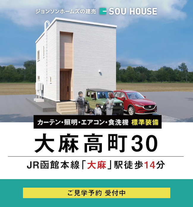 江別市大麻高町A 見学会 現地住所:江別市大麻高町30(住居表示) ●JR函館本線「大麻」駅 徒歩14分 ●大麻東小学校・大麻東中学校エリア 来場予約はこちらから簡単入力 イベント 会場 —以下から選択してください—江別市大麻高町A ご希望日(火・水曜定休) ご希望時間 ご希望時間を選択してください10:00~11:00~12:00~13:00~14:00~15:00~16:00~17:00~18:00~(月~金のみ)19:00~(月~金のみ) お名前 姓 名 電話番号(ハイフン(-)なし) メールアドレス 郵便番号 都道府県 都道府県を選択してください北海道青森県岩手県宮城県秋田県山形県福島県茨城県栃木県群馬県埼玉県千葉県東京都神奈川県新潟県富山県石川県福井県山梨県長野県岐阜県静岡県愛知県三重県滋賀県京都府大阪府兵庫県奈良県和歌山県鳥取県島根県岡山県広島県山口県徳島県香川県愛媛県高知県福岡県佐賀県長崎県熊本県大分県宮崎県鹿児島県沖縄県 市区町村 町域以下 SOU HOUSEをどこでお知りになりましたか? 選択してくださいInstagramWEB検索facebookYoutubeTikTokCMチラシラジオ紹介住宅展示場DM(ダイレクトメール)メルマガLINE運営ショップ通りがかり看板スーモカウンター等の窓口紹介スーモ不動産サイトその他 ご覧になったことのある広告を教えてください テレビCMラジオCM地下鉄広告屋外看板見たことはない ご意見・ご質問(300文字以内) 前のイベント 一覧に戻る 次のイベント TOPイベント情報江別市大麻高町A 資料請求 まずはSOU HOUSEを知りたい方へ ご自宅でご覧いただける、SOUHOUSEの家づくりがわかる無料パンフレットをお送りいたします。 資料請求はこちら 来場・相談予約 実際の建物見学をしたい方へ 住まいを体感したい方へ。ご見学と一緒にお客様の条件に合わせた住まいのご提案も行います。 来場・相談予約はこちら