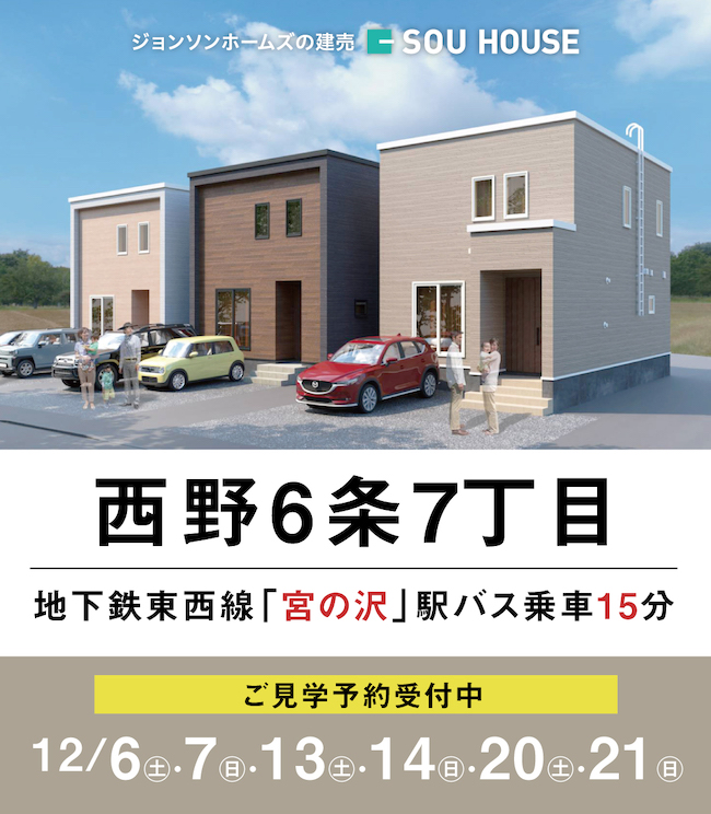 西野6条7丁目 見学会 現地住所:札幌市西区西野6条7丁目3(住居表示) ●地下鉄東西線「宮の沢」駅 バス乗車15分 ●西野第二小学校・西野中学校エリア 来場予約はこちらから簡単入力 イベント 会場 —以下から選択してください—西区西野6条7丁目 B棟 ご希望日(火・水曜定休) ご希望時間 ご希望時間を選択してください10:00~11:00~12:00~13:00~14:00~15:00~16:00~17:00~18:00~(月~金のみ)19:00~(月~金のみ) お名前 姓 名 電話番号(ハイフン(-)なし) メールアドレス 郵便番号 都道府県 都道府県を選択してください北海道青森県岩手県宮城県秋田県山形県福島県茨城県栃木県群馬県埼玉県千葉県東京都神奈川県新潟県富山県石川県福井県山梨県長野県岐阜県静岡県愛知県三重県滋賀県京都府大阪府兵庫県奈良県和歌山県鳥取県島根県岡山県広島県山口県徳島県香川県愛媛県高知県福岡県佐賀県長崎県熊本県大分県宮崎県鹿児島県沖縄県 市区町村 町域以下 SOU HOUSEをどこでお知りになりましたか? 選択してくださいInstagramWEB検索facebookYoutubeCMチラシラジオ紹介住宅展示場DM(ダイレクトメール)メルマガLINE運営ショップ通りがかり看板スーモカウンター等の窓口紹介スーモ不動産サイトその他 ご覧になったことのある広告を教えてください テレビCMラジオCM地下鉄広告屋外看板見たことはない ご意見・ご質問(300文字以内) 前のイベント 一覧に戻る 次のイベント TOPイベント情報西野6条7丁目 資料請求 まずはSOU HOUSEを知りたい方へ ご自宅でご覧いただける、SOUHOUSEの家づくりがわかる無料パンフレットをお送りいたします。 資料請求はこちら 来場・相談予約 実際の建物見学をしたい方へ 住まいを体感したい方へ。ご見学と一緒にお客様の条件に合わせた住まいのご提案も行います。 来場・相談予約はこちら