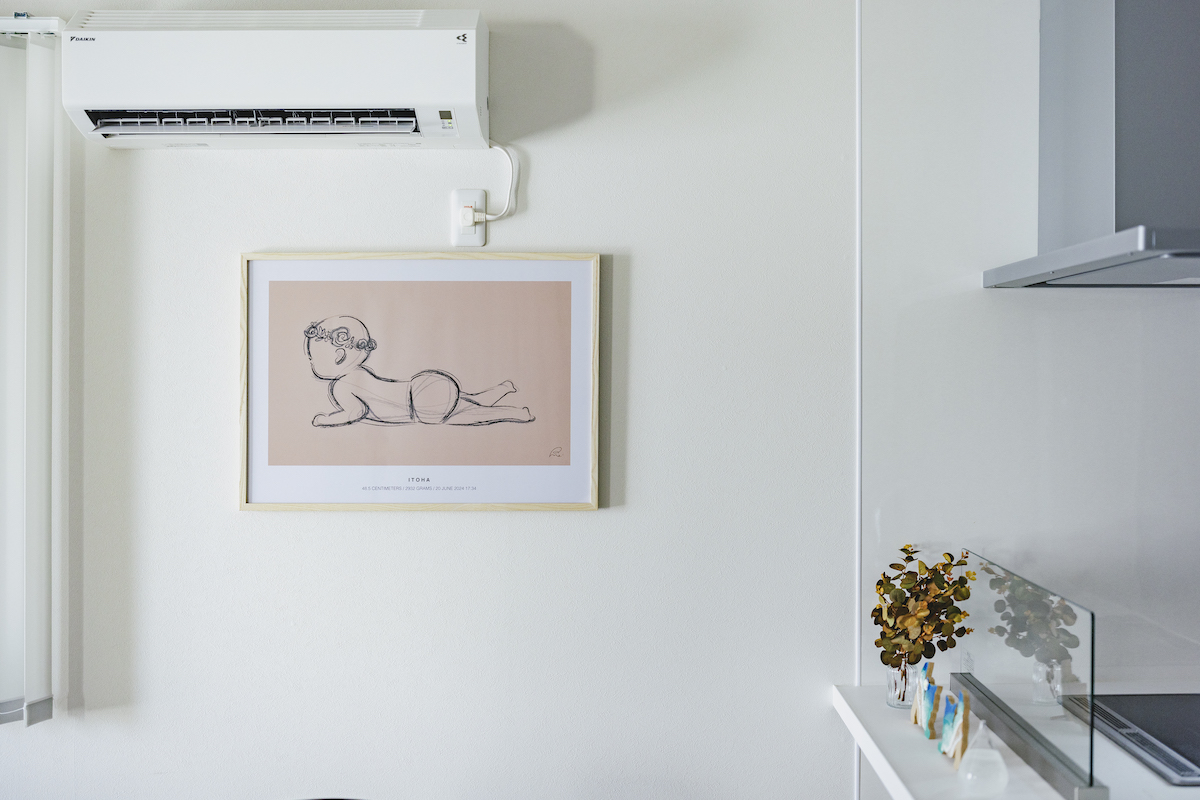ダイニングには、娘が生まれたときの記念のイラストを飾りました。ずっと飾りたいと思っていた絵なので、この家に来てようやく叶って嬉しいです。